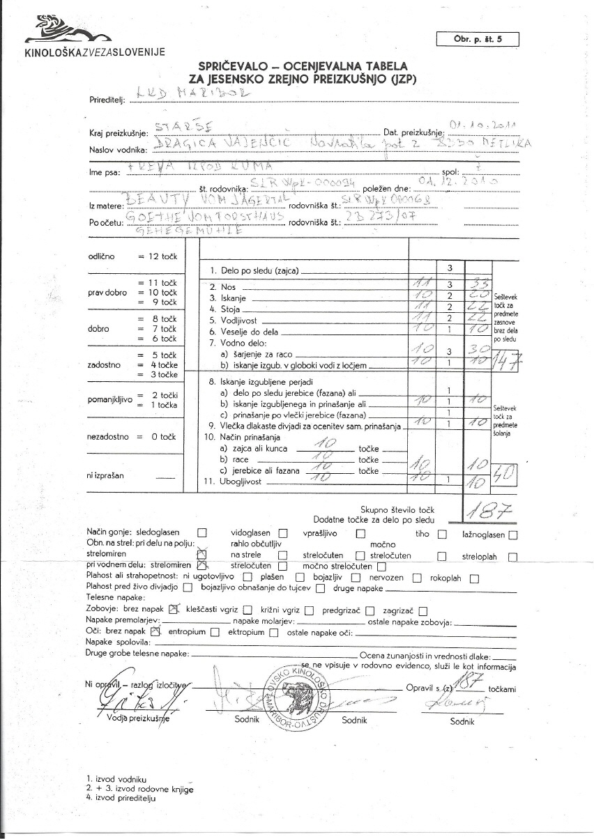 Die erste Hündin, die Goethe v.FG gedeckt hatte kam aus Slovenien. Die Züchterin Korošec Sergeja züchtet auf Form und Leistung. Es kamen am 01.12.2010 12 Welpen zur Welt. Leider überlebten nicht alle. Jedoch läßt sich nun schon vermuten wie leistungsstark die Hunde sind. Die erste Hündin (beim Züchter verblieben) ist mit 10 Monaten HZP in Slovenien gelaufen, mit sagenhaften 187 Punkten. Herzlichen Glückwunsch dazu!