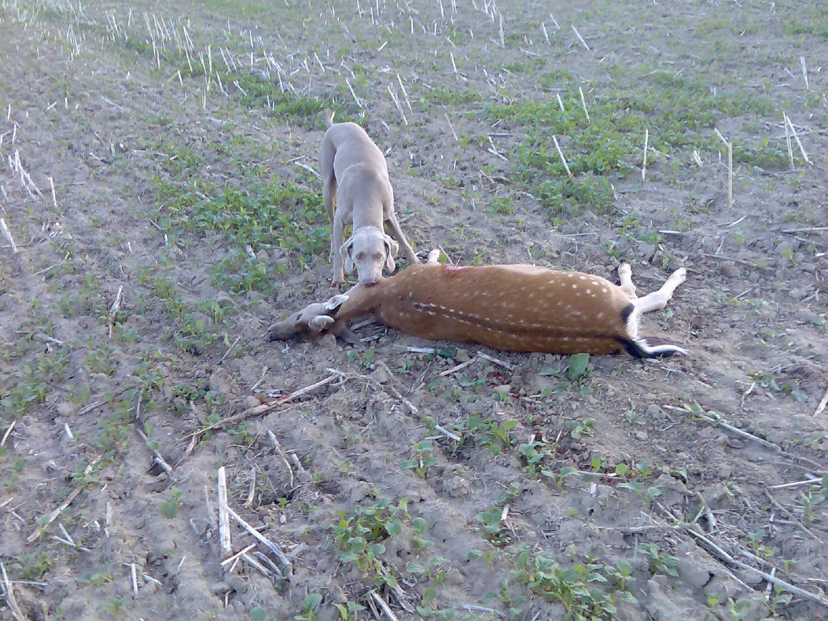 Wir haben gewaidwerkt und Shadow durfte nachsuchen :-). Der Damspießer war zwar schon verendet, aber sie mußte ihn noch einmal an der Drossel packen und abschütteln ;-). Sie saß mit uns wie immer zusammen auf der Kanzel und wenn was erlegt wird, dann darf sie natürlich immer als erste ans Stück. Es macht mit ihr immer großen Spaß.