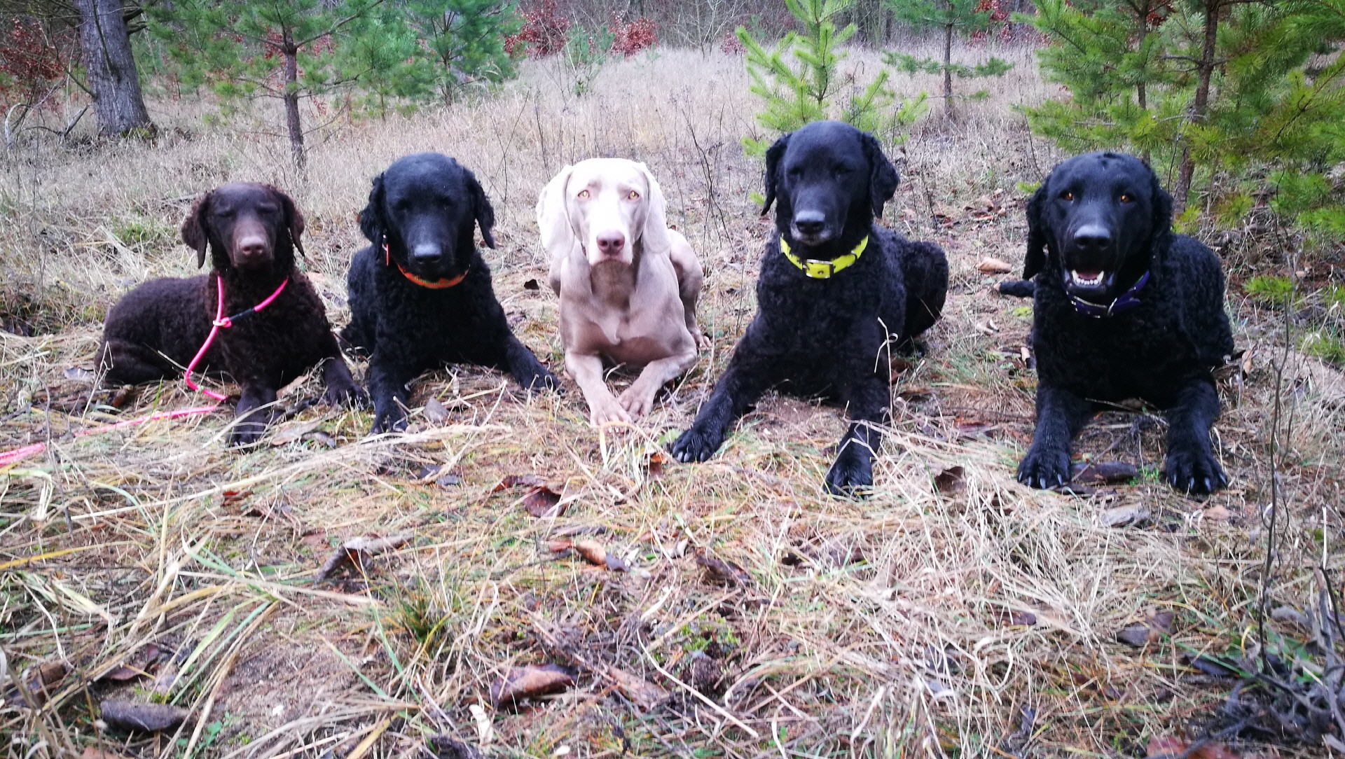Zur Zeit leben bei uns 3 Weimaraner; Gwendoline eine Tochter aus Cayenne; eine Tochter aus Gayana (die leider viel zu frü verunglückte); Hannelore und Dorne von Leubingen seit 2017, sowie 4 Curly Coated Retriever-Hündinnen Engadin Stars Imea seit 2011 aus der Schweiz zu uns gezogen und zwei ihrerer Töchter aus dem A-Wurf ; Waterfowlhunters Annabella und - Annemarie und seit 2018 eine Tochter auch Annemarie, welche Cosmi heißt.